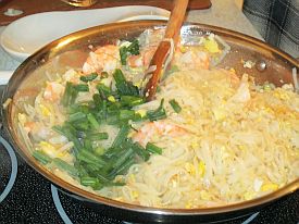 That's an excellent Pad Thai recipe. I've made it several times. I've found from experience, though, that tryng to make up multiple servings at once is more than a matter of doubling (or quadrupling, or whatever) the ingredients. Doing that results in soggy noodles and egg chunks, overcooked shrimp, mushy peanuts and limp bits of green onion, with the whole mess tasting unpleasantly fishy and vinegary. So, I used the Evans' recipe as a starting point for making one of my own, capable of serving three or four people without sacrificing texture or flavor.